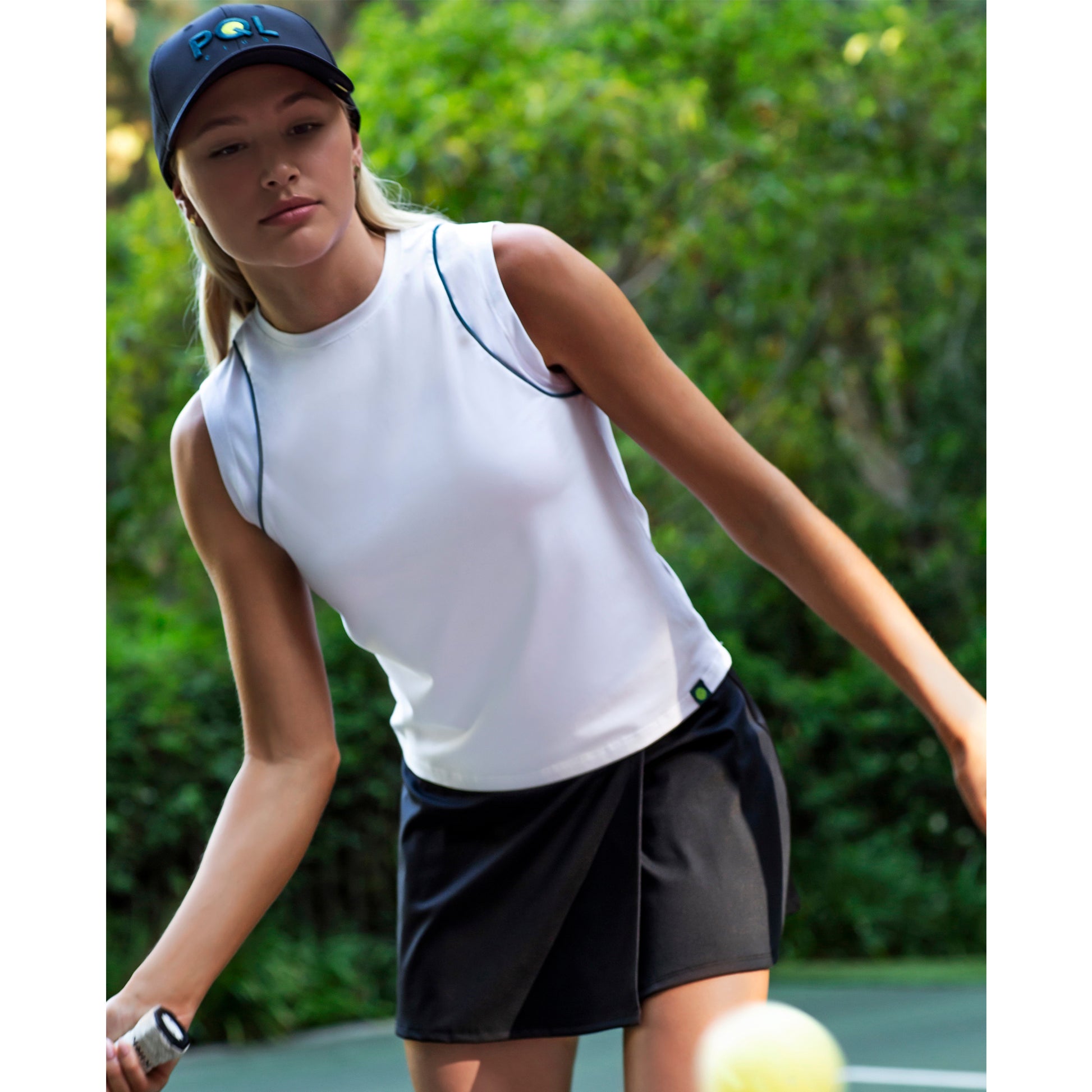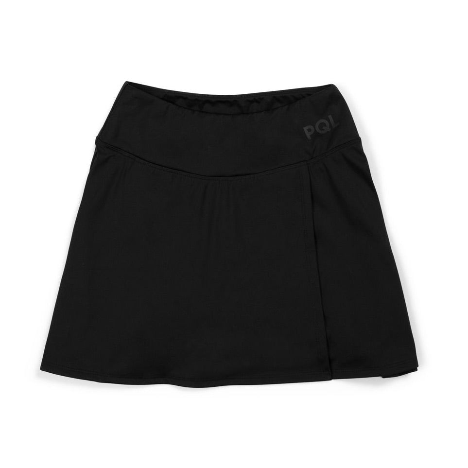 High-waisted wrap skirt with inseam liner boyshort and side mesh pockets. Moisture wicking tech fabric. Slight flared hem. PQL Club logo in 3D rubber print placed on the left side of the waistband. 70% nylon, 30% spandex